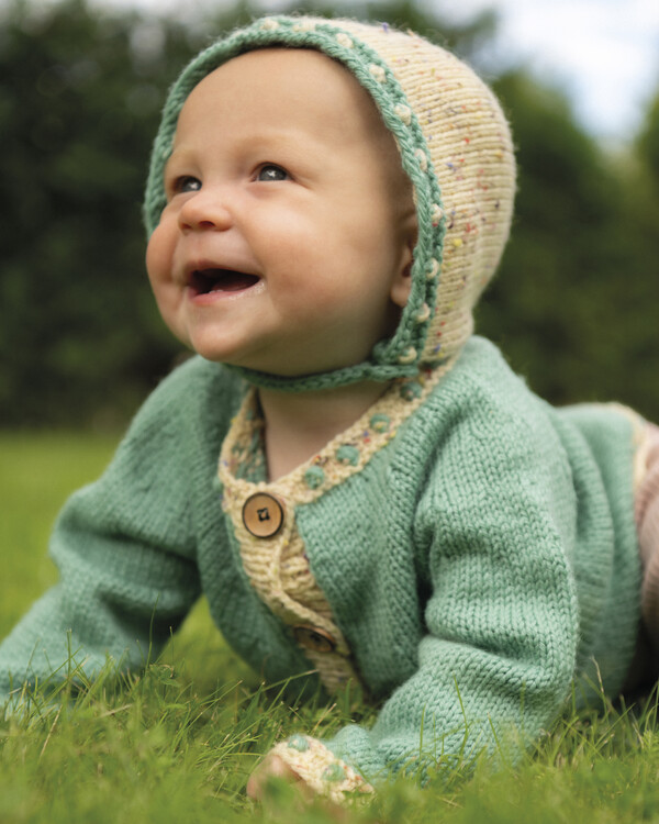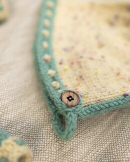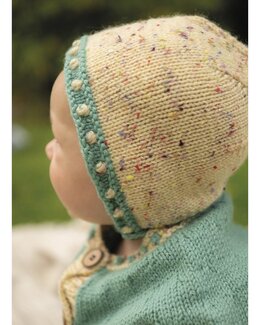 Eine süße Babymütze mit einem kontrastfarbenen Rand und kleinen dekorativen Details, die das Gesicht schön einrahmen.
