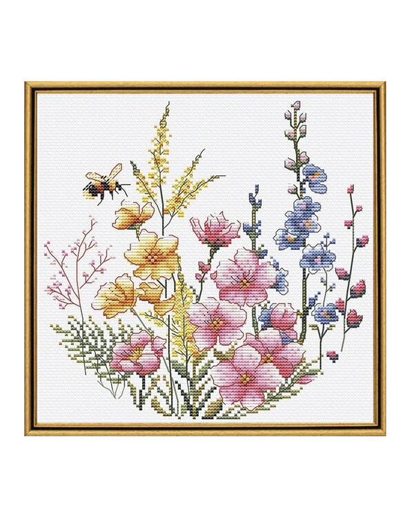Die feinen Blumen zusammen mit der kleinen Biene verleihen dem Motiv einen natürlichen und harmonischen Ausdruck, der perfekt als zeitloses Stickbild für dein Zuhause oder als Geschenk für alle, die Blumen und Natur lieben, geeignet ist.