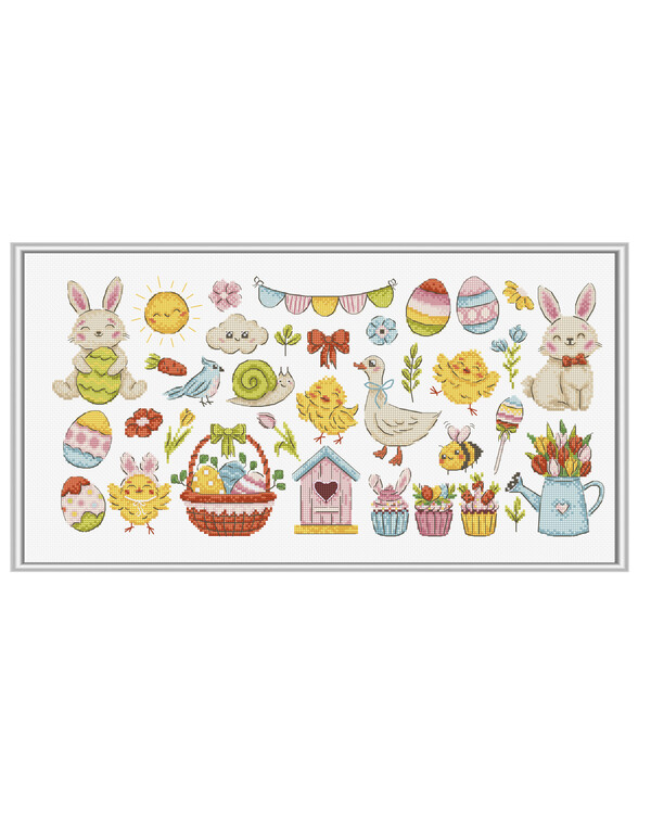 Ein charmante Stickpackung, randvoll mit kleinen Oster-Motiven in Kreuzstich. Hier findest du niedliche Hasen, Küken, Ostereier, Blumen und Frühlingsdeko in zarten Pastellfarben.
