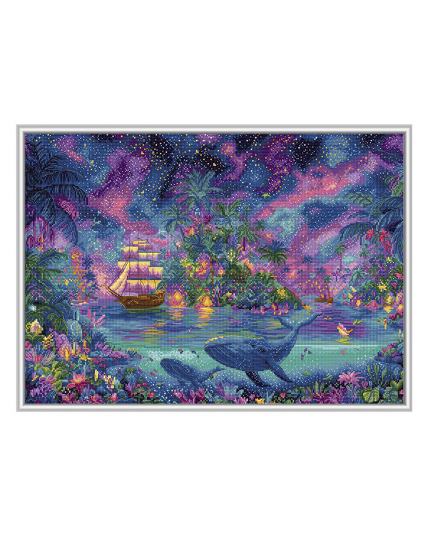 Ein farbenfrohes, fantasievolles Stickmotiv mit einer tropischen Landschaft unter einem sternenklaren Himmel.