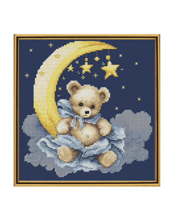 Träum dich weg zu den Sternen mit dieser süßen Stickpackung! Ein weicher Teddybär ruht auf den Wolken unter einem golden...