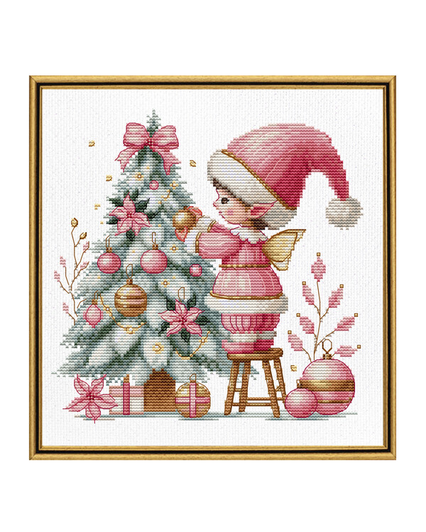 Dieses stimmungsvolle Stickpackung fängt einen ruhigen Weihnachtsmoment ein, in dem ein kleiner Engel mit Weihnachtsmütze liebevoll den Baum schmückt.