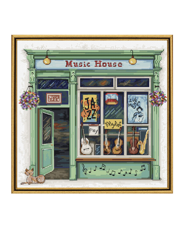 Erschaffe ein lebendiges und charmantes Stickbild mit diesem detailreichen Motiv eines gemütlichen Musikladens in Kreuzstich.