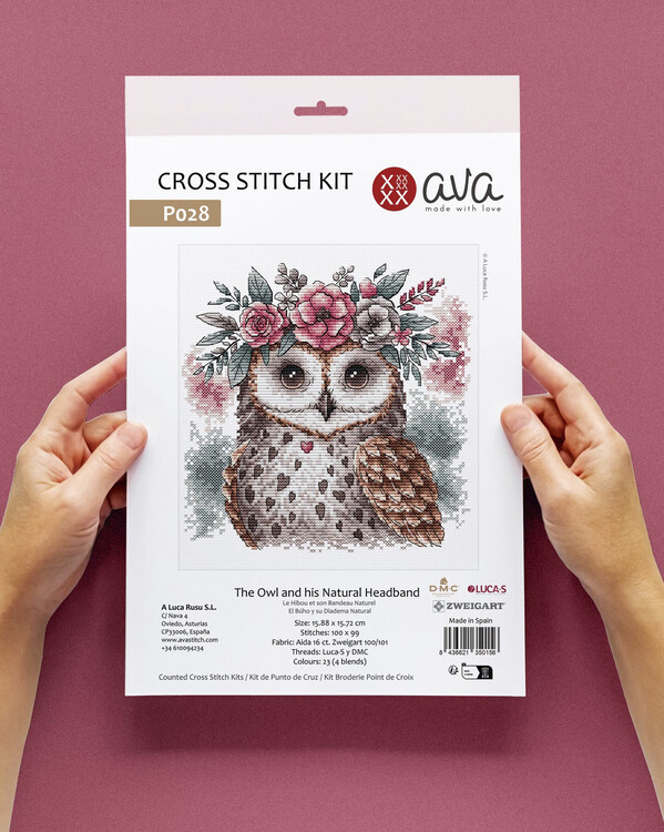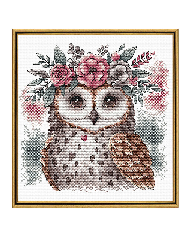 Charmantes Kreuzstich-Stickerei mit einem detailreichen Tiermotiv: eine süße Eule mit einem farbenfrohen Blumenkranz.