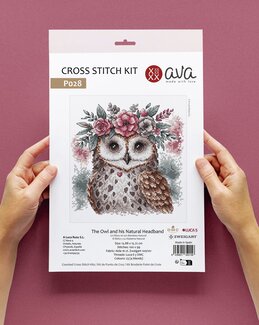 Charmantes Kreuzstich-Stickerei mit einem detailreichen Tiermotiv: eine süße Eule mit einem farbenfrohen Blumenkranz. Ei...