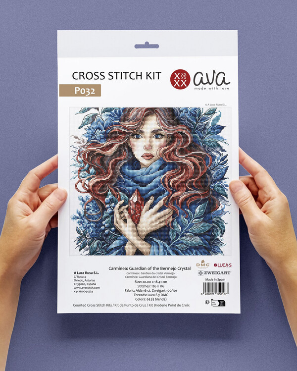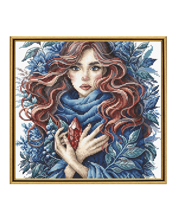 Fesselndes Stickmotiv im Kreuzstich einer schönen Frau mit feuerrotem Haar, umgeben von blauen Tönen und winterlicher Pflanzenwelt.