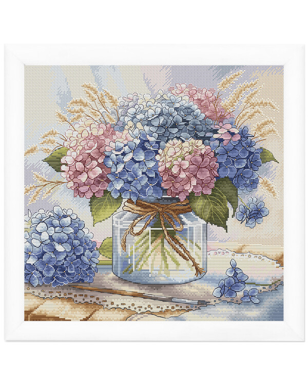 Wunderschönes Kreuzstich-Motiv mit blauen, rosa und lila Hortensien in einer Glasvase. Ein stilvolles und romantisches S...