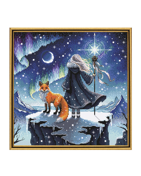Ein stimmungsvolles Wintermotiv im Kreuzstich, bei dem ein Mädchen und ein Fuchs über eine schneebedeckte Landschaft unter einem magischen Nordlicht blicken.