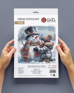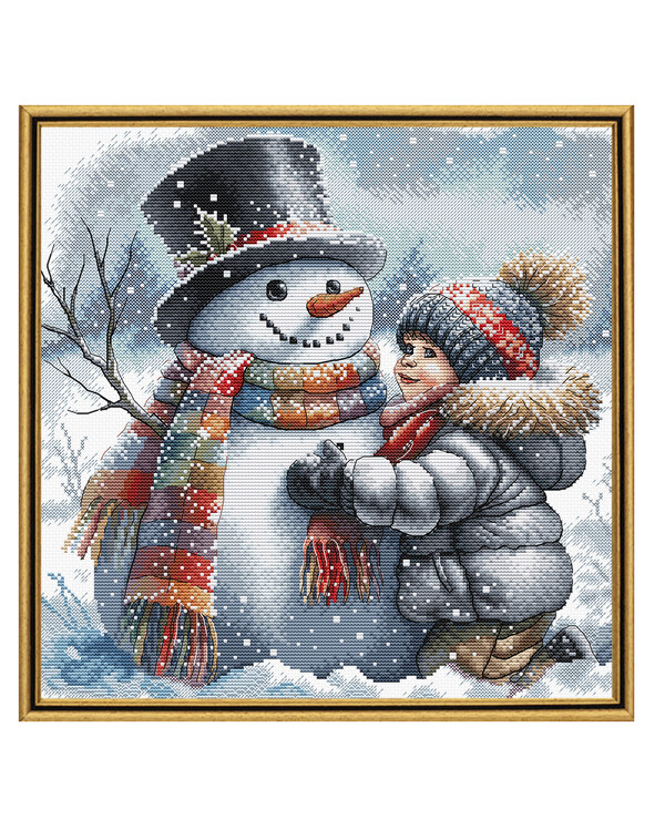 Kreiere ein warmes Wintermotiv mit diesem charmanten Kreuzstich-Stickpackung, das ein Kind zeigt, das einen Schneemann u...