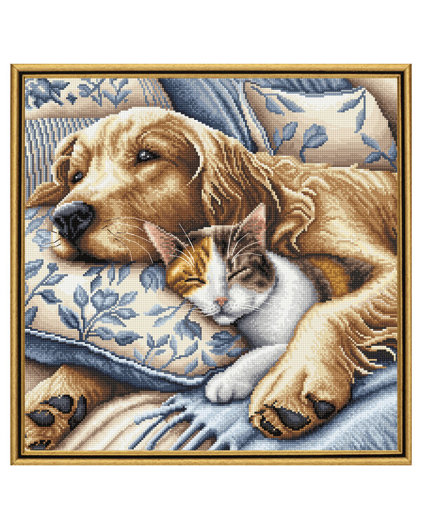 Ein warmes und liebevolles Stickmotiv, bei dem ein Hund und eine Katze gemeinsam auf weichen Kissen und Decken ruhen.