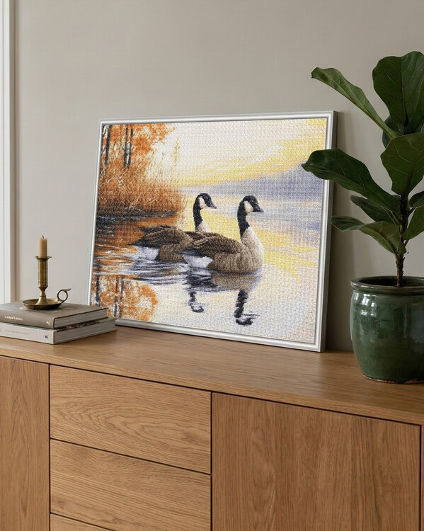 Ein stimmungsvolles Kreuzstichmotiv mit zwei Gänsen, die ruhig über spiegelglattes Wasser im sanften goldenen Licht gleiten. Das Schilf und der stille See schaffen eine harmonische Naturstimmung, die deinem Zuhause Ruhe und Ausgeglichenheit verleiht.